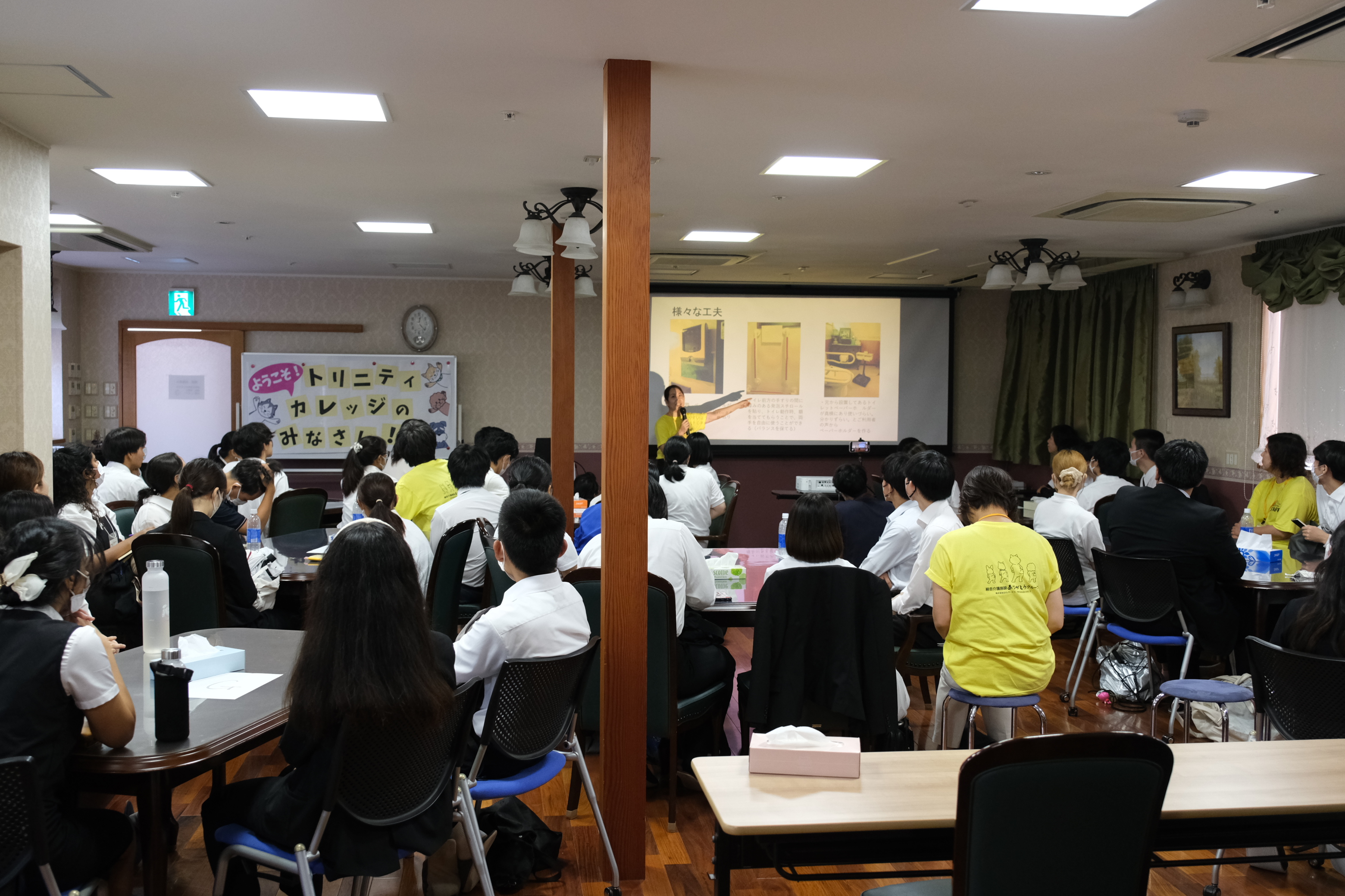 2025年8月29日(金)にトリニティカレッジ広島医療福祉専門学校の2年生43名と先生2名が、ありがとうグループに見学に来てくださいました。1日かけて総合介護施設ありがとうと、アクティブワンを見学していただきました。
